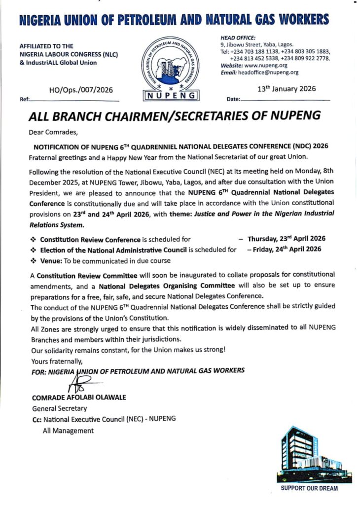 The Nigeria Union of Petroleum and Natural Gas Workers (NUPENG)- TEPNG Branch and the Management of TotalEnergies EP Nigeria Limited (TEPNG) formally opened their 2026 Annual Collective Bargaining Negotiations at the Lagos Continental Hotel, Victoria Island.